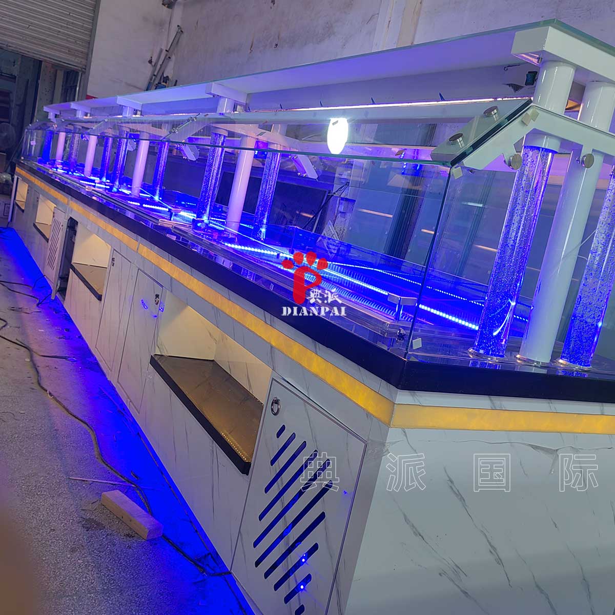 这款属于冷台布菲台,主要用于寿司、刺身、冷菜、甜品、水果等区域。冷台结构在设计阶段就充分考虑了实际使用需求,温控稳定,台面高度、取餐动线都按照真实餐厅运营场景来做,而不是单纯追求外观。很多美国餐厅老板在第一次沟通时都会提到一句话:“好看很重要,但一定要好用。”这也是典派国际一直坚持的设计原则。