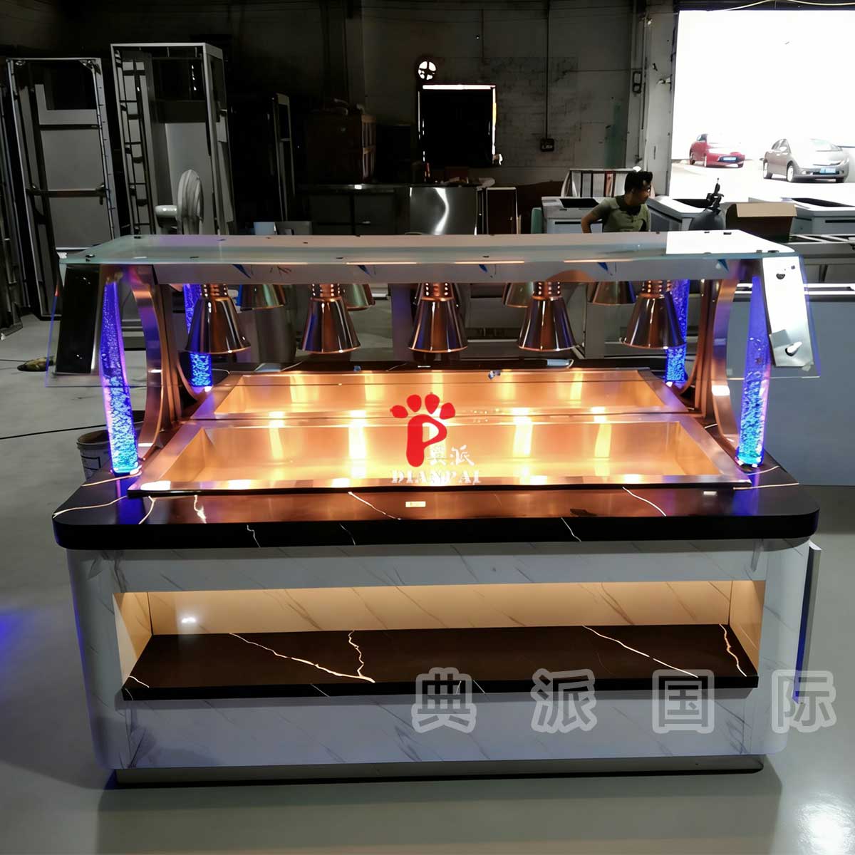在生产现场可以看到,整个自助餐台定制过程是分步骤推进的。首先是主体结构的制作,采用加厚钢材进行框架焊接,确保长期使用的稳定性;随后进入台面与饰面安装阶段,不同区域根据功能需求选择不同材质,比如热食区、冷藏区、展示区都会有区分;接着是灯光系统与电路的预埋,这部分在工厂内提前完成,可以有效避免后期在餐厅现场施工带来的不确定因素。