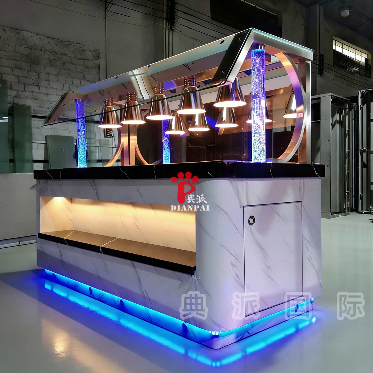 加拿大餐厅项目,这一批画面直接来自生产一线,没有经过刻意包装,而是典派国际工厂真实的车间状态。镜头所呈现的,正是这批发往加拿大餐厅的自助餐台在制作过程中的每一个环节。从钢结构搭建到面板安装,再到灯光与功能模块的嵌入,全部在典派自助餐台生产体系内完成。