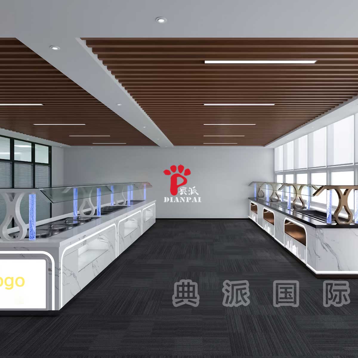 靠墙式自助餐台的设计灵感源于现代简约风,整体线条简洁流畅,白色大理石柜体设计为餐台增添了一份质感和轻松感。典派国际在设计时,会根据单位食堂的大小和用餐人数进行定制,确保餐台的长度、分区布局和高度都贴合实际使用需求。这样一来,无论食堂面积是宽敞的大厅还是中等空间,都能实现合理布置,让职工在取餐时自然顺手。