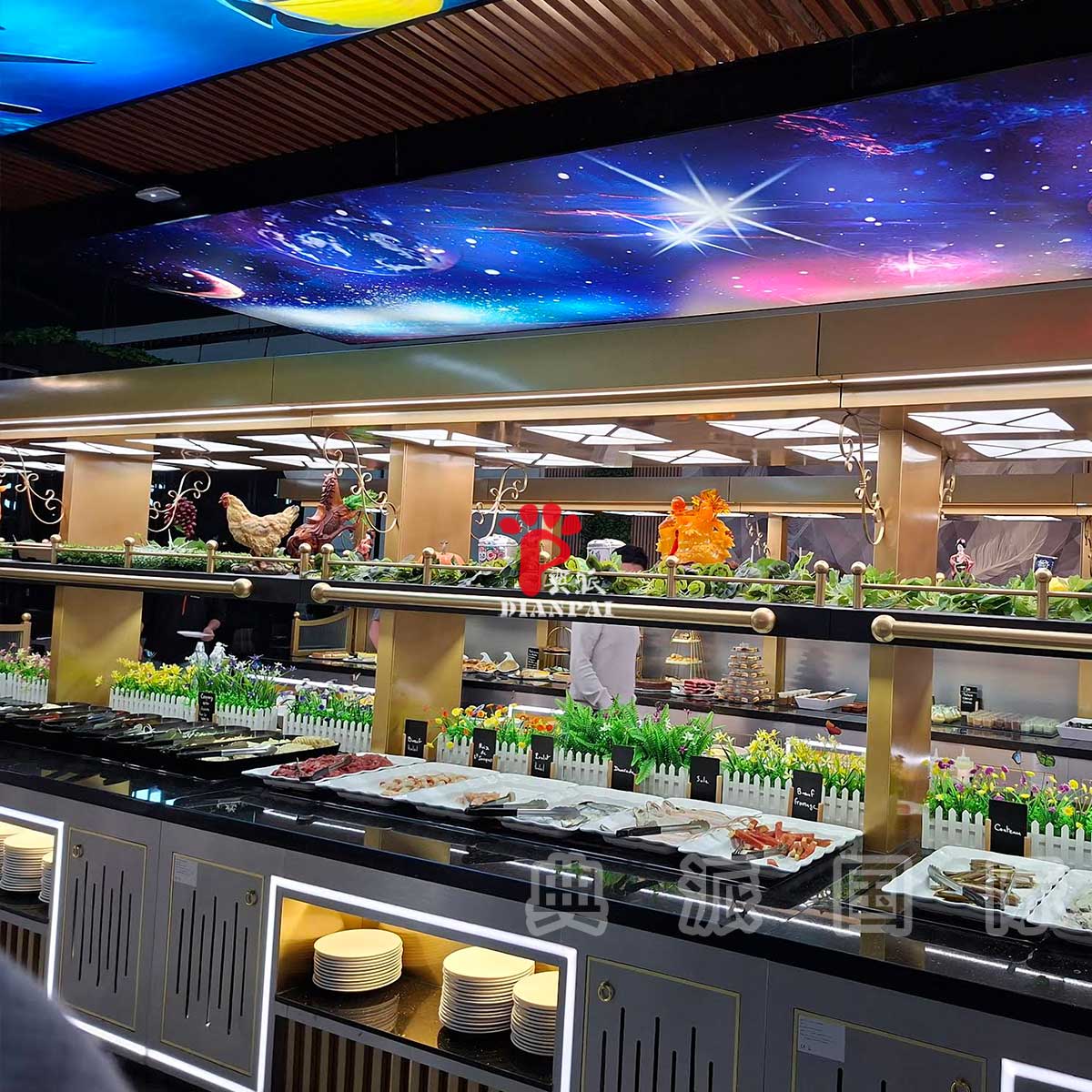 从功能角度来看,这类自助餐台通常会根据不同餐品进行分区设计。例如寿司区域会采用更加开阔、平面的布局,方便顾客自由取餐,同时保证视觉上的整齐与清爽;热食区域则会搭配保温系统,确保菜品温度稳定;冷菜、海鲜或水果区域则更注重展示效果与保鲜条件。不同区域之间既有明确划分,又在整体风格上保持统一,使整个自助餐动线更加自然流畅。